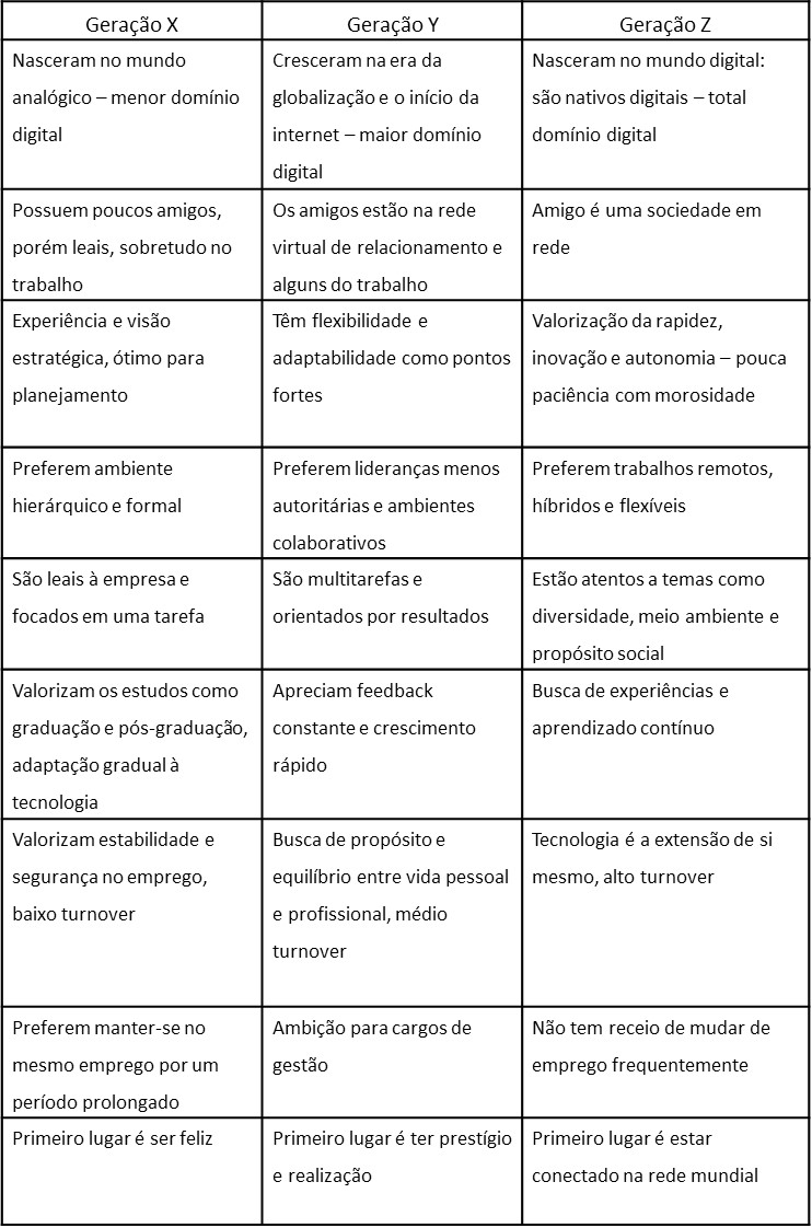 As três gerações aqui apresentadas possuem qualidades e problemas – ninguém é perfeito. Se por um lado a geração X possui mais experiência, demonstra maior lealdade e apresenta visão estratégica com planejamento eficiente; por outro lado, as gerações Y e Z possuem maior conhecimento no uso da tecnologia digital, destreza em multitarefa e agilidade nas tarefas. Portanto, significa que criar relações entre as gerações é saudável para a organização empresarial: a troca de conhecimentos, habilidades e atitudes são fundamentais.